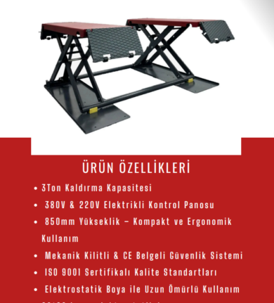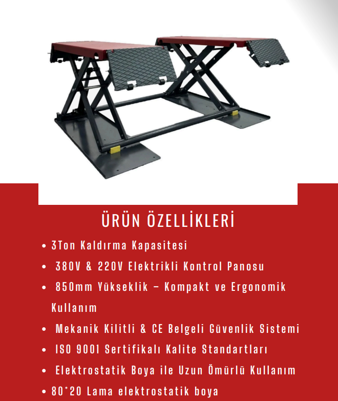 3 ton kaldırma kapasitesine sahip olan bu sistem, 380 V elektrikli kontrol panosu ile standart olarak sunulmakta olup isteğe bağlı olarak 220 V elektrikli kontrol panosu seçeneğiyle de kullanılabilir. 850 mm yüksekliği sayesinde kompakt ve ergonomik bir kullanım sunarak dar alanlarda bile verimli çalışma imkânı sağlar. Gövdesinde kullanılan 80*20 lama malzeme, elektrostatik fırın boya (toz boya) ile kaplanarak uzun ömürlü ve dayanıklı bir yapı oluşturur. Güvenlik ön planda tutularak mekanik kilit sistemiyle donatılmış olup CE belgeli güvenlik standartlarına sahiptir. Ayrıca ISO 9001 sertifikalı kalite standartlarına uygun olarak üretilmiştir. Ürünlerimizde yenilemelerden ötürü güncel özellikler için bizimle iletişime geçebilirsiniz.